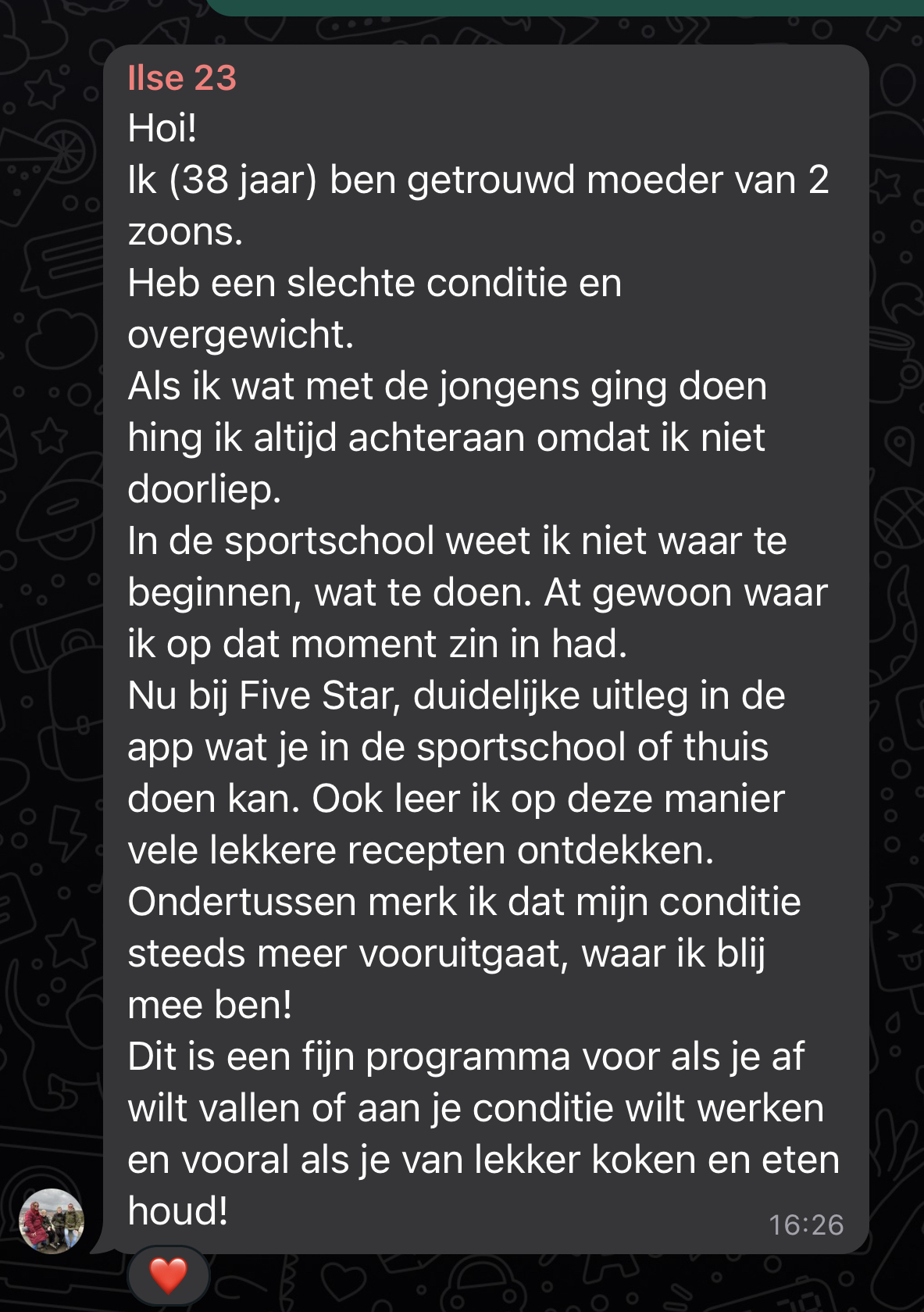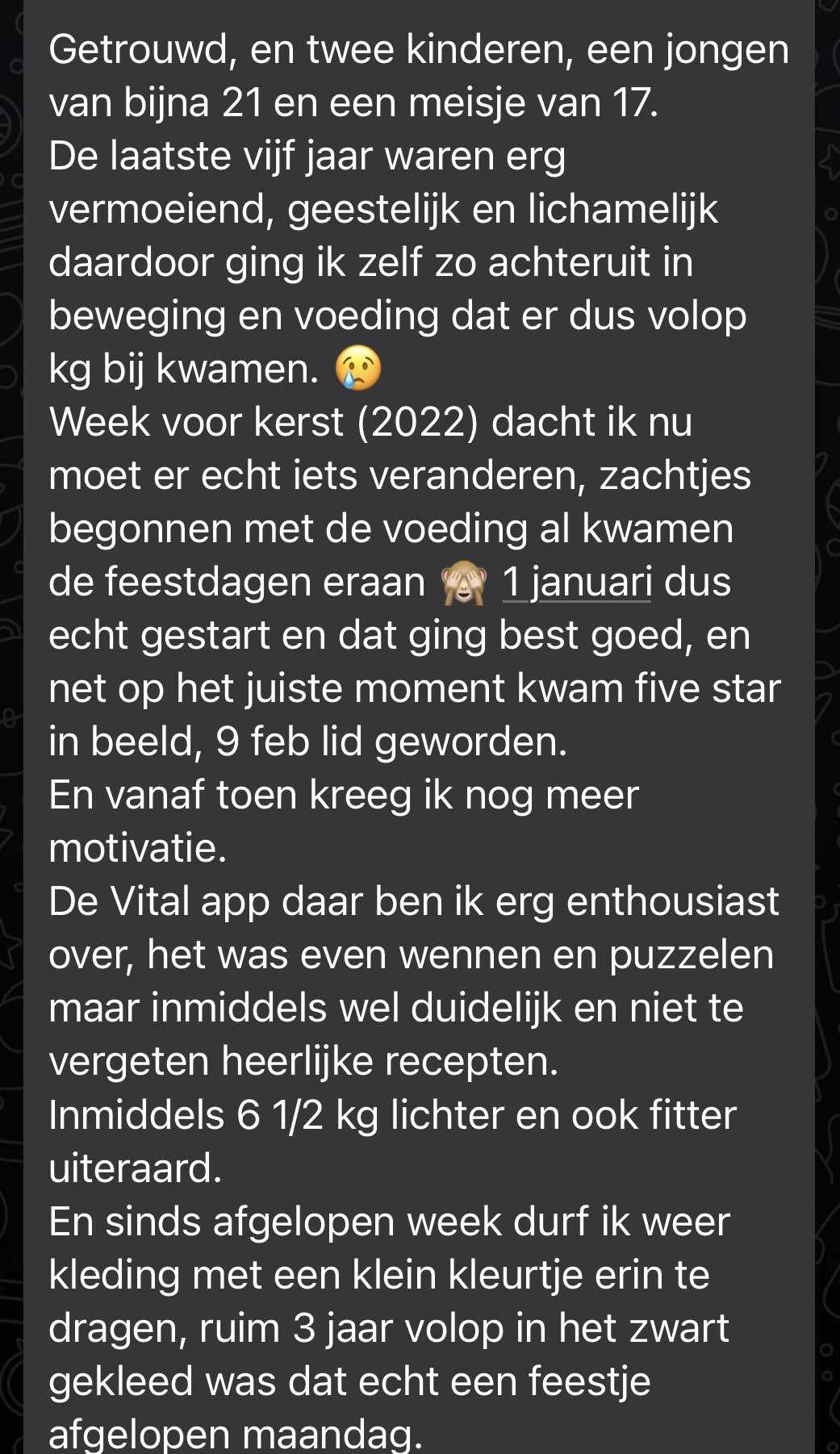 “zelf heb ik lang gedacht dat ik gewoon zo was en het maar moest accepteren, tot de eerste Corona golf waarbij ik het anders wou aanpakken.. Door aan te melden bij FiveStarCoaching ben ik begonnen met super veel te leren over voeding en iedere week een Personal training ging ik sporten voortaan leuk vinden.