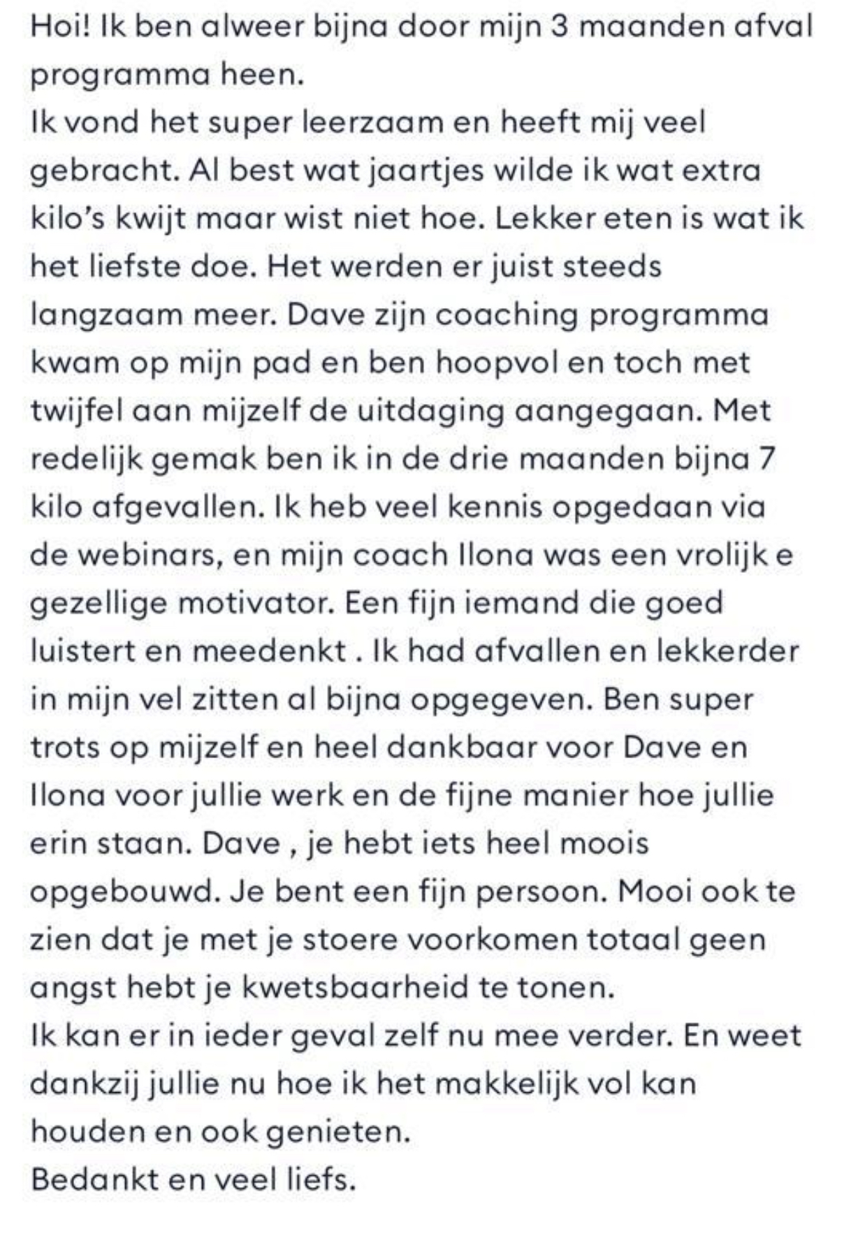Zo gingen we aan de slag waarbij de laatste week intensief gecoacht werd door Dave himself! Ik ben erg trots op het eind resultaat en had nooit verwacht dat zoiets überhaupt mogelijk zou zijn. Nu het komende jaar blijf ik onder de coaching om een goede balans te vinden!